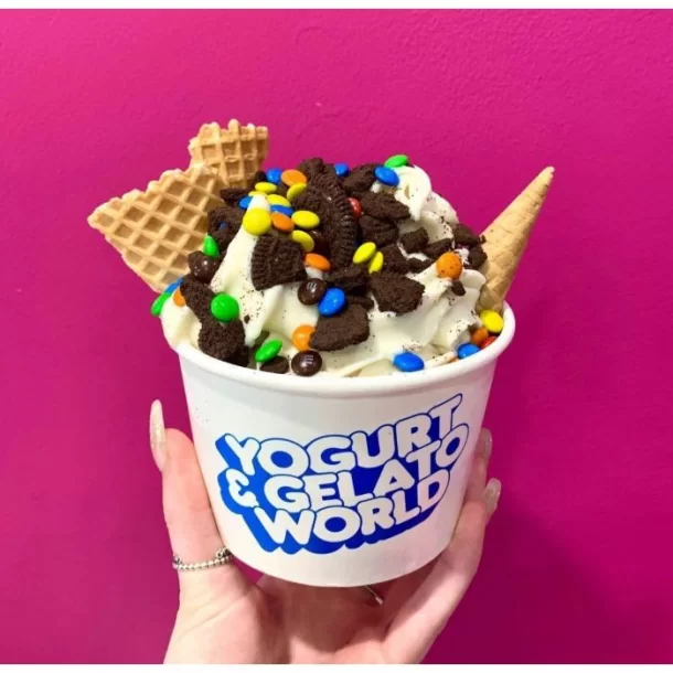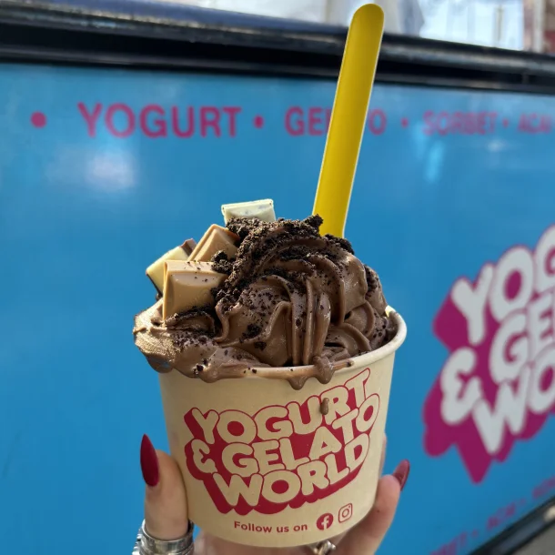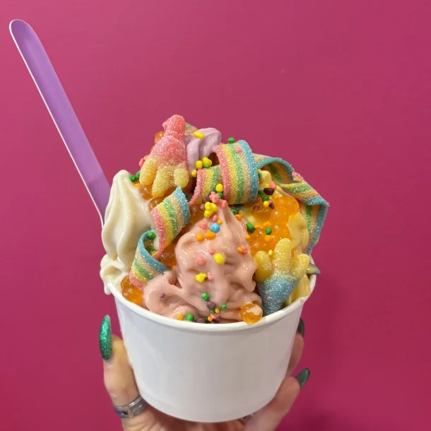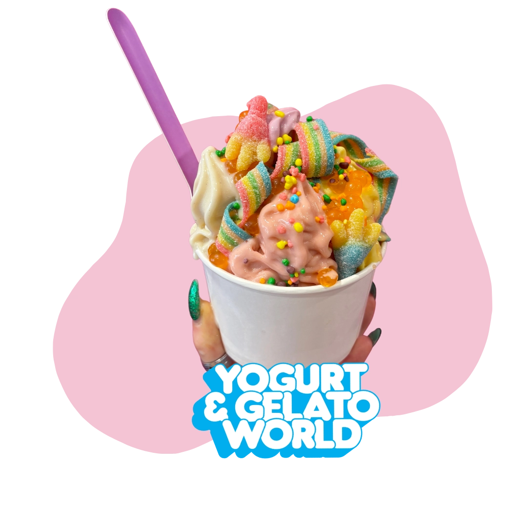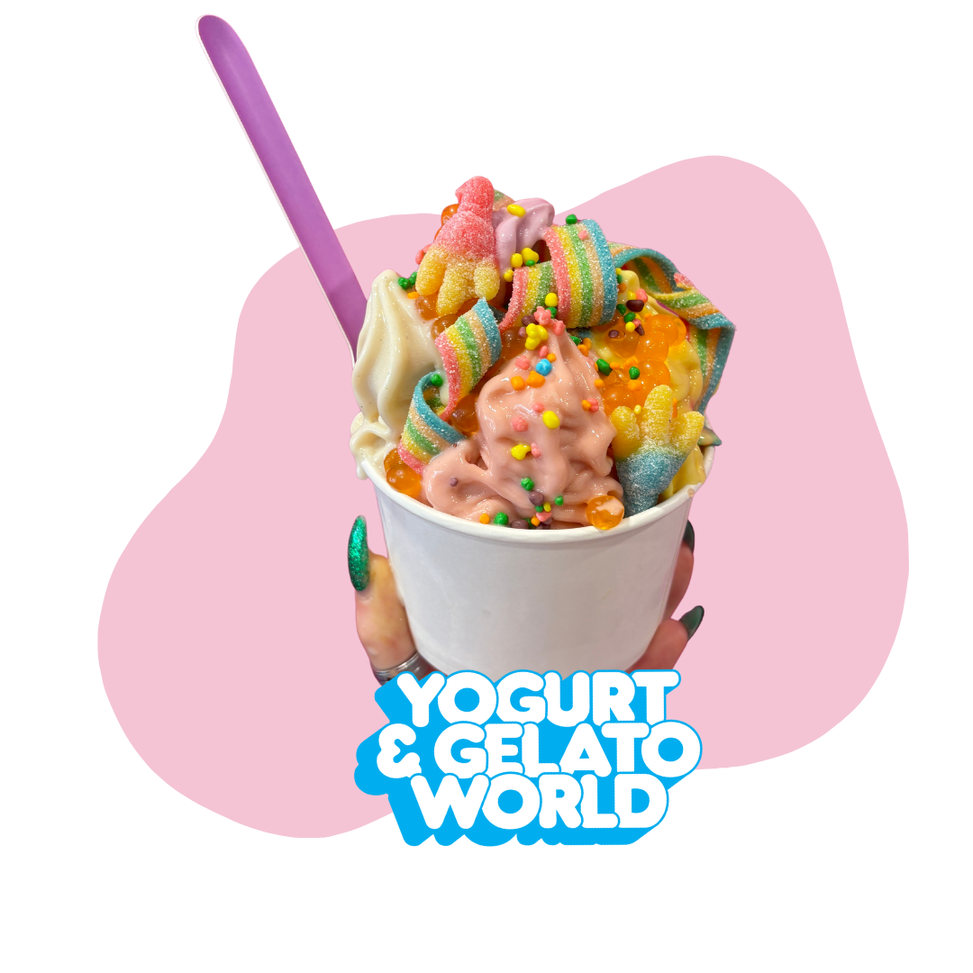 Self-serve Frozen Yogurt, Sorbet, Acai and Gelato, with Vegan, Nut-Free, and Gluten-Free options available.